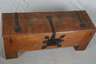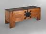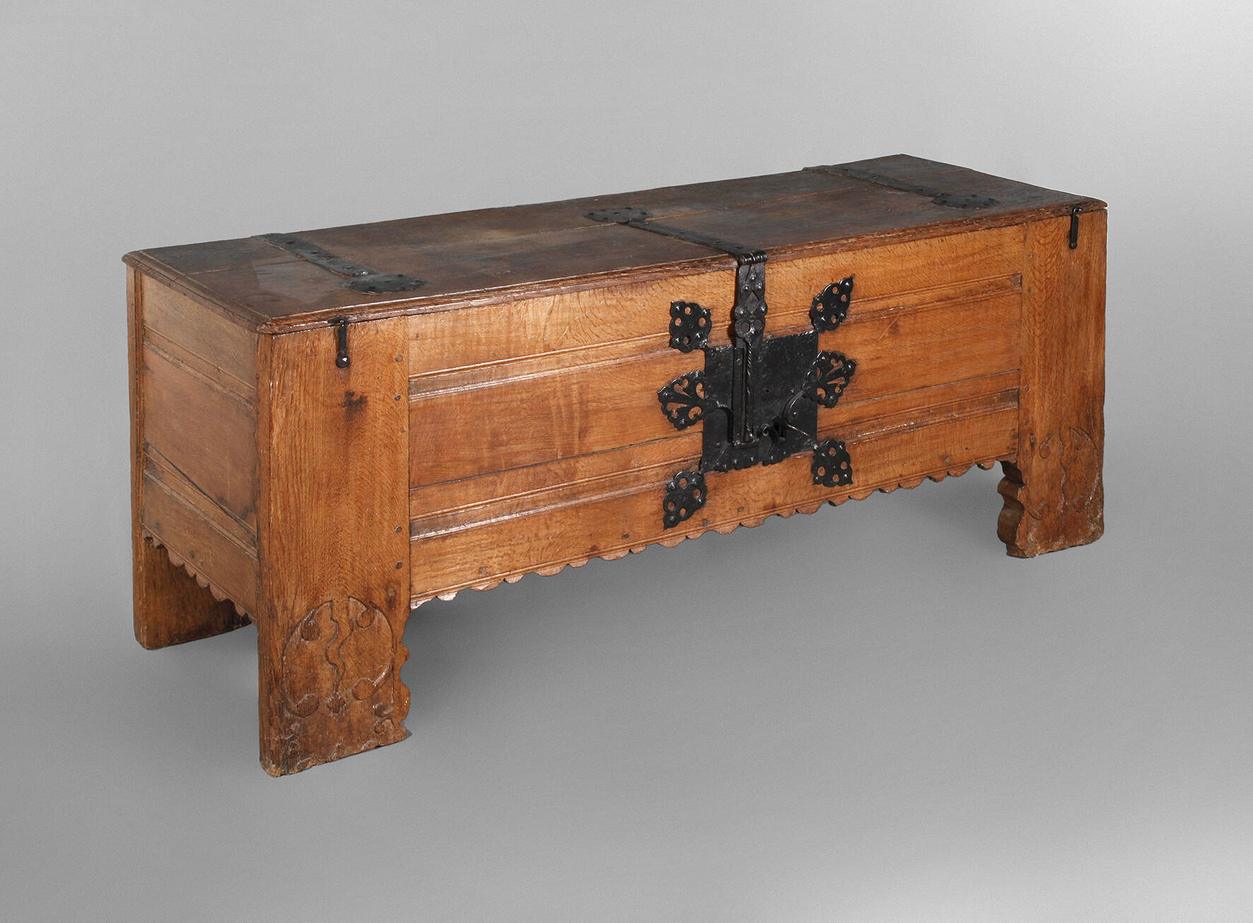 Spanien, 18. Jh., Eiche massiv, Front mit dekorativen Zierbeschlägen und aufgesetztem Schloss, der untere Abschluss mit Wellendekor, Trocknungsrisse, Alters- und Gebrauchsspuren, Maße 71 x 175 x 59 cm.