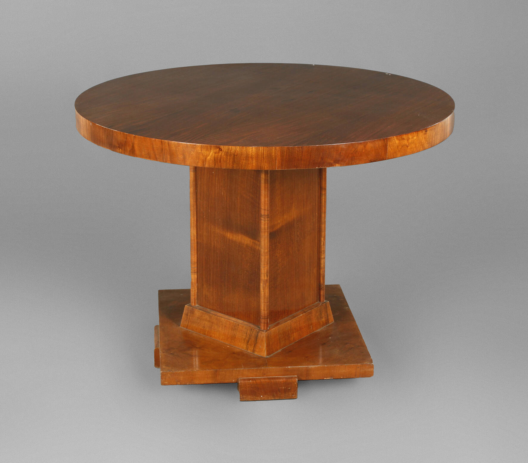 deutsch, um 1930, Nussbaum furniert, runde Platte auf quadratischem Fuß, die Ecken mit Rundstäben verziert, alt restauriert, H 77 cm, D 100 cm.