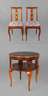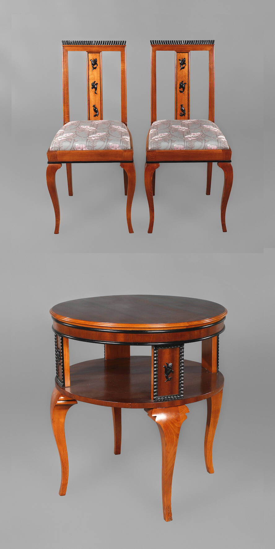 deutsch, 1920er Jahre, bestehend aus rundem Tisch und zwei Stühlen, Buche massiv, partiell ebonisiert, Tischplatten in Mahagoni furniert, wohnfertig restauriert, Bezüge erneuert, Maße Tisch 74 cm, D 72 cm.