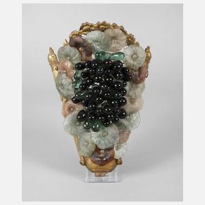 1920er Jahre, viertelkreisförmiger Korpus aus mehrteilig gegossener und verschraubter Bronze, die Front verziert von plastischen Blüten und Trauben aus mehrfarbigem Pressglas, Altersspuren, einflammig neu elektrifiziert, Altersspuren, H 30 cm.