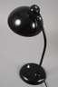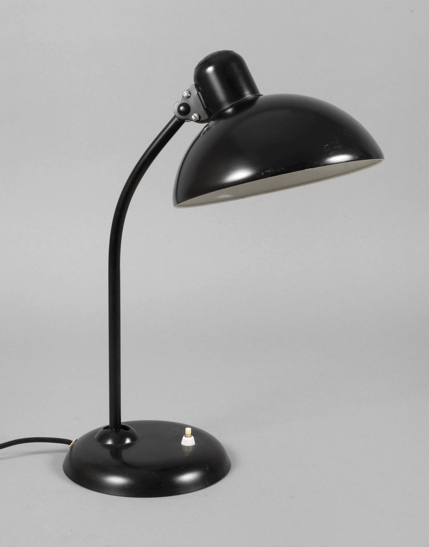 Entwurf Christian Dell 1933/34, gemarkt, geschwärzter Metallrundfuß mit Druckschalter, schwenkbarer Leuchterarm, schwarz lackierter, an Kugelgelenk variabel platzierbarer Lampenschirm, einflammig elektrifiziert, gute Erhaltung, H max. 46 cm.