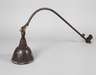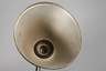 um 1930, auf Schirm mit altem Klebeetikett gemarkt, Klemmleuchte aus braun gefasstem Eisenblech mit abgehängtem Glockenschirm, einflammig alt elektrifiziert, etwas rest.bed., H ca. 70 cm.