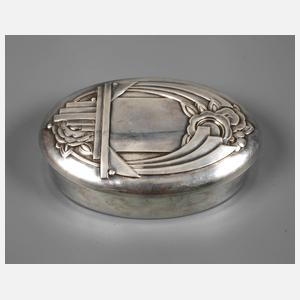 um 1925, Metall versilbert und innen vergoldet, abnehmbarer Deckel mit floralen und geometrischen Reliefs, mittig eine offene Monogrammkartusche, guter Zustand, L 11,5 cm, G ca. 153 g.
