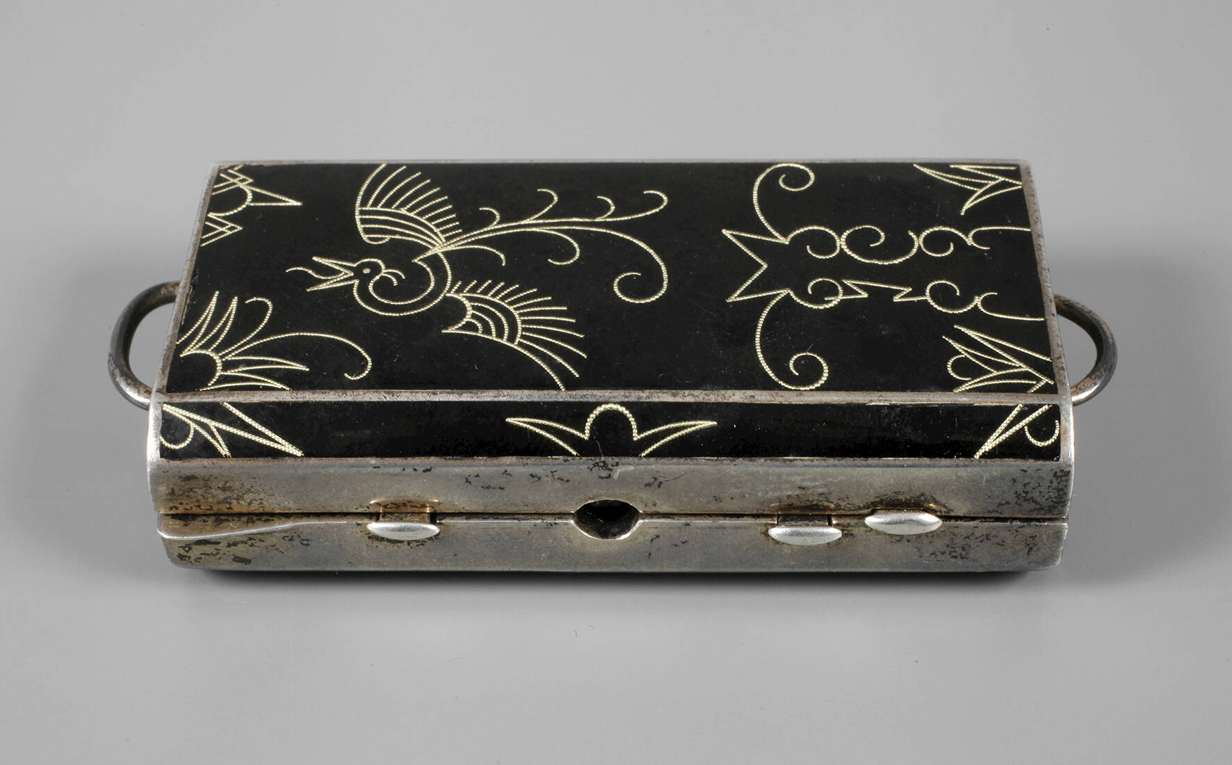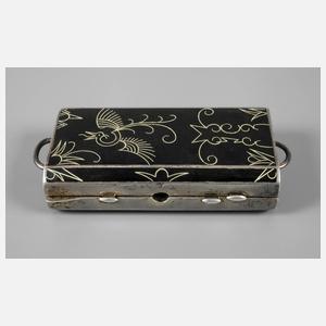 um 1920, Silberstempel 925, zwei weitere unleserliche runde Stempel, innen vergoldet, mit drei Fächern, davon zwei mit scharniertem und graviertem Deckel, außen schwarz emailliert mit feinen Perlbändern als Silberdrahteinlagen, stilisierte Vogelmotive und Ornamente, an den Seiten gravierte Blütenranken und zwei Ösenhenkel, ohne Spiegel, Emaille mit kleinen Fehlstellen, Drücker fehlt, L 9,5 cm, G ca. 162 g.