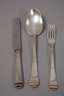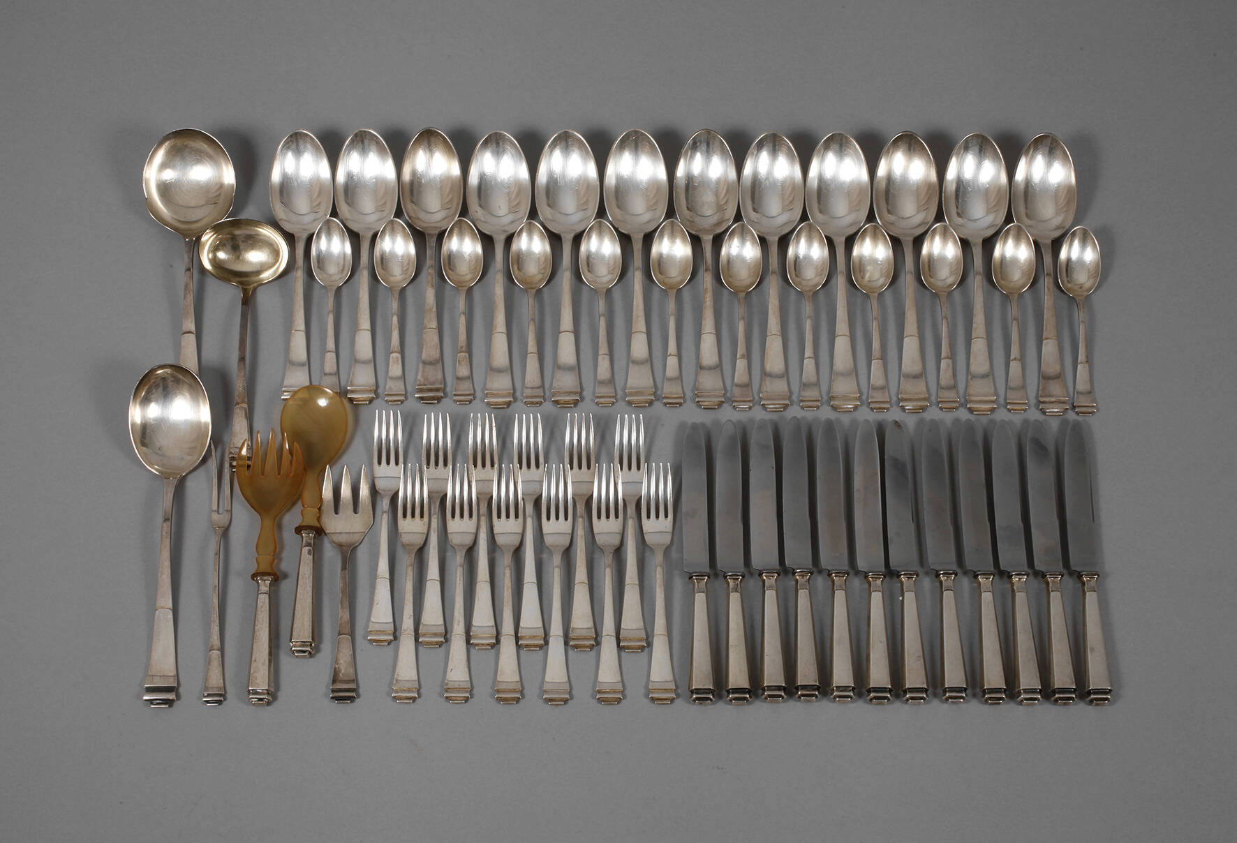 um 1925, Werksentwurf, Hersteller Wilkens & Söhne Hemelingen, gestempelt Halbmond, Krone, 800, neusachliche Gestaltung, 12 Speiselöffel, 12 Abendbrotmesser mit erneuerten Stahlklingen, 12 Abendbrotgabeln, 12 Kaffeelöffel sowie sieben Vorlegeteile, das Salatbesteck mit Hornlaffen, Gebrauchsspuren, G total ca. 2873 g. Quelle: Jochen Amme, Historische Bestecke, Arnoldsche, S. 533, Nr. 820.