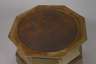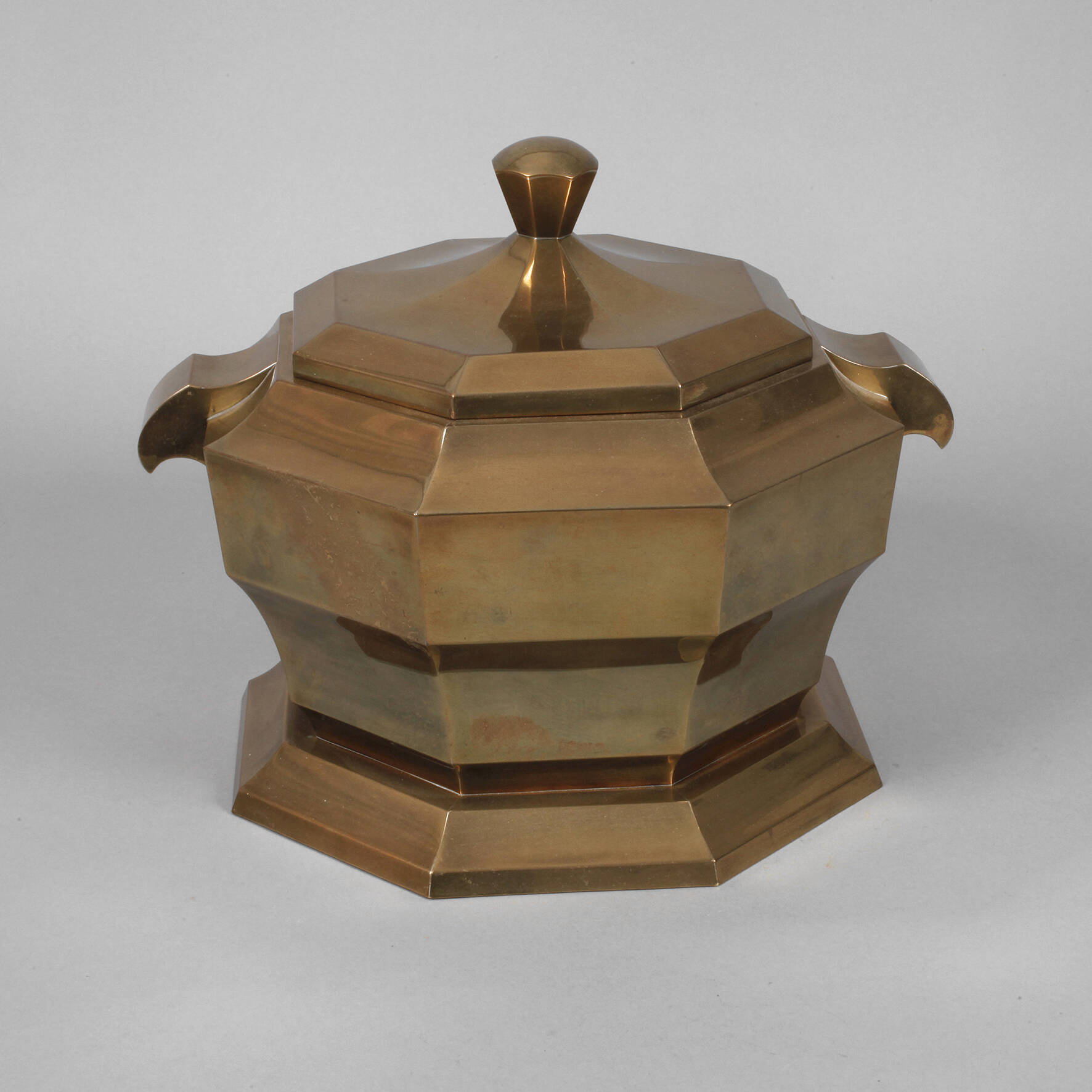 deutsch, um 1925, ungemarkt, Messing handgetrieben, sehr aufwendig doppelwandig gearbeitet, oktogonal facettiert, gewölbte Handhaben, Deckel mit hohl gearbeitetem Knauf, leichte Altersspuren, H 32 cm.