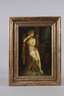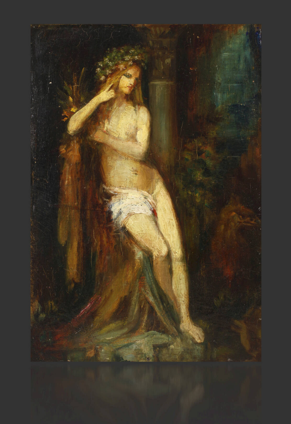 Moreaus malerisches Interesse galt vor allem antiken, mystischen, biblischen oder phantastischen Darstellungen, die er nicht selten kombinierte, die jeweiligen Geschichten waren für den Künstler Mittel zur Verbildlichung von Gefühlswelten, Gedanken und Erfahrungen, Moreau thematisierte so nicht selten sein eigenes, von Ängsten und Depressionen - aber auch glücklichen Phasen geprägtes Leben, vorliegendes Motiv "La fée aux griffons [dt.: Die Greifenfee]" schuf Moreau um 1876, es zeigt eine nahezu nackte junge Frau an einem Weiher vor einer dunklen Grotte, ihr Kopfschmuck und die Garben in ihrer linken Hand lassen sie als Ceres - Göttin der Fruchtbarkeit - erscheinen, sie lehnt scheinbar entspannt an einer mächtigen Säule, auf der eine geflügelte Urne thront und wird von zwei unheimlichen Greifen bewacht, erst auf den zweiten Blick wird man der Schlange gewahr, die sich aus dem Schoß der unnahbaren Schönheit windet, der Künstler spielt hier wohl auch auf die mystische Sage von den Thrien - jenen jungfräulichen Bergnymphen - an, die der Kunst der Weissagung mittels kleiner Kieselsteine, welche sie in eine Urne warfen, mächtig waren, diesen Nymphen wurde jedoch auch Falschheit und Bestechlichkeit nachgesagt, in ihrer geradezu symbolistisch leuchtenden Schönheit zeigt Moreau eine Szene voll geheimnisvollem Verlangen und subtiler Gefahr und verdeutlicht seine eigene Einstellung zur Weiblichkeit, lediglich die symbolische Barriere der Szene zum Betrachter - durch den See - lässt diesen die jenseitige Szene gefahrlos schauernd betrachten, möglicherweise handelt es sich bei der vorliegenden dunkeltonig-emailartig festgehaltenen, mit flottem Pinselduktus und schönem Licht erfassten Malerei um eine Kompositionsstudie von der Hand Moreaus, wesentliche Elemente und die Lichtstimmung des fertigen Gemäldes sind hier bereits angelegt, so sind die junge nackte Frau, die Säule und einer der Greifen deutlich zu erkennen, offensichtlich wurde die Studie seitlich beschnitten - und Moreau wählte letztendlich in seinem fertigen Gemälde zur Steigerung des Eindrucks ein noch höheres Format und fügte am Unterrand des Gemäldes den trennenden See und am oberen Ende der Säule besagte Urne hinzu, Öl auf Karton, um 1875, unsigniert, rückseitig Atelierspuren und Zuschreibung "Dieses Bild ist von Gustave Moreau, geb. Paris 1826-1898", farbschwundrissig, Malgrund gebaucht, in alter versilberter Leiste gerahmt, Falzmaße ca. 33 x 23 cm. Künstlerinfo: frz. Maler und Zeichner des Symbolismus (1826 Paris bis 1898 Paris), erste Ausbildung beim Vater, dem Architekten Louis Moreau, 1836-40 Sekundarschulbildung am Collège Rollin, 1841 erster Italienaufenthalt, 1844-46 gefördert durch François-Edouard Picot, studierte 1846-49 an der Pariser Akademie, 1849-50 autodidaktische Studien im Louvre, ab 1851 freundschaftliche Förderung durch den Ingres-Schüler Théodore Chassériau (1819-1856), 1852-80 Ausstellungsbeteiligung im Pariser Salon, unternahm nach dem Tod Chassériaus, zusammen mit Frédéric de Courcy, 1857-59 zweite Studienreisen nach Italien und weilte in Neapel, Rom, Florenz, Mailand, Lugano, Pisa, Siena und Venedig, hier beeinflusst von Renaissance-Künstlern wie Leonardo da Vinci, Sandro Botticelli, Andrea Mantegna, Michelangelo Buonarroti, Paolo Veronese, Raffael, Antonio da Correggio, Vittore Carpaccio und Carlo Crivelli, in Italien Freundschaft zu Élie Delaunay, Léon Bonnat und Edgar Degas, ca. 1860 Bekanntschaft mit seiner Lebensgefährtin Alexandrine Dureux (1835-1890), 1865 auf Einladung Kaiser Napoleon III. in Compiègne, 1878 vertreten auf der Weltausstellung Paris, 1883 Offizier der Ehrenlegion, ab 1888 Mitglied der Pariser Akademie, ab 1892 als Nachfolger seines Freundes Elie Delaunay (1828-1891) Professor an der École des Beaux-Arts Paris, Quelle: Thieme-Becker, Saur "Bio-Bibliographisches Künstlerlexikon", Bénézit, Müller-Singer, Seubert, Müller-Klunzinger, Info Museum Moreau Paris und Wikipedia.