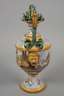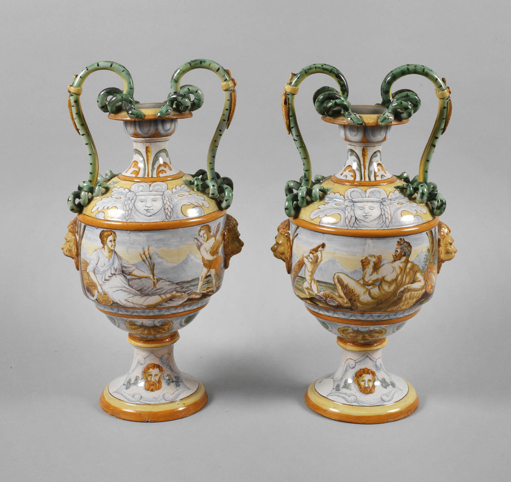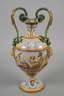 Italien, 19. Jh., ungemarkt, im Renaissancestil, umlaufend bemalt mit mythologischen Szenen, applizierte Henkel in Schlangenform, ein Fuß sauber geklebt, H 48 cm.