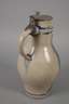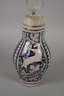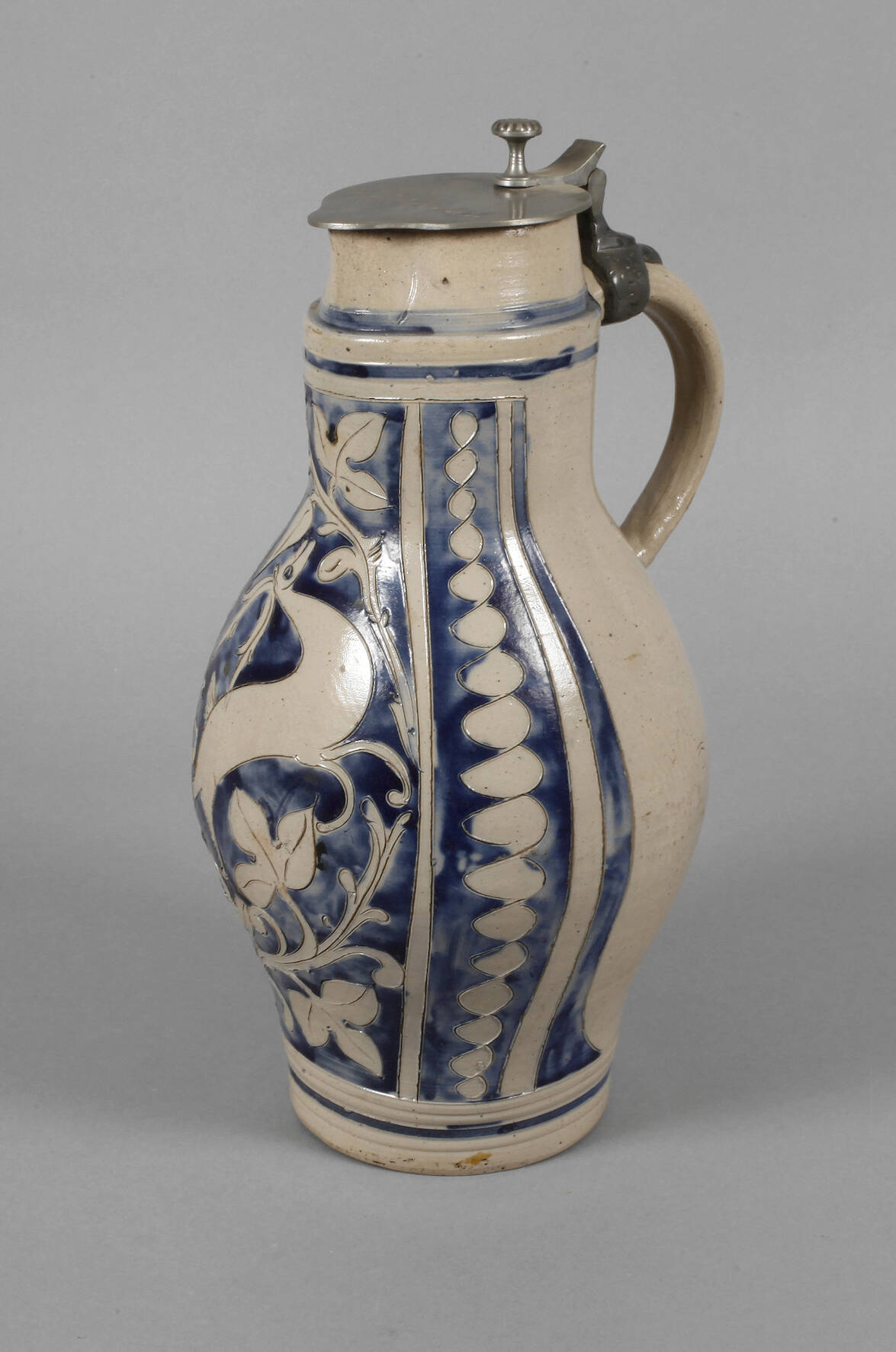 2. Hälfte 19. Jh., graues Steinzeug salzglasiert und blau bemalt, geritzter Dekor mit springendem Hirsch, Zinndeckel, Mündung mit zwei Fehlstellen, H 40 cm.