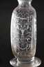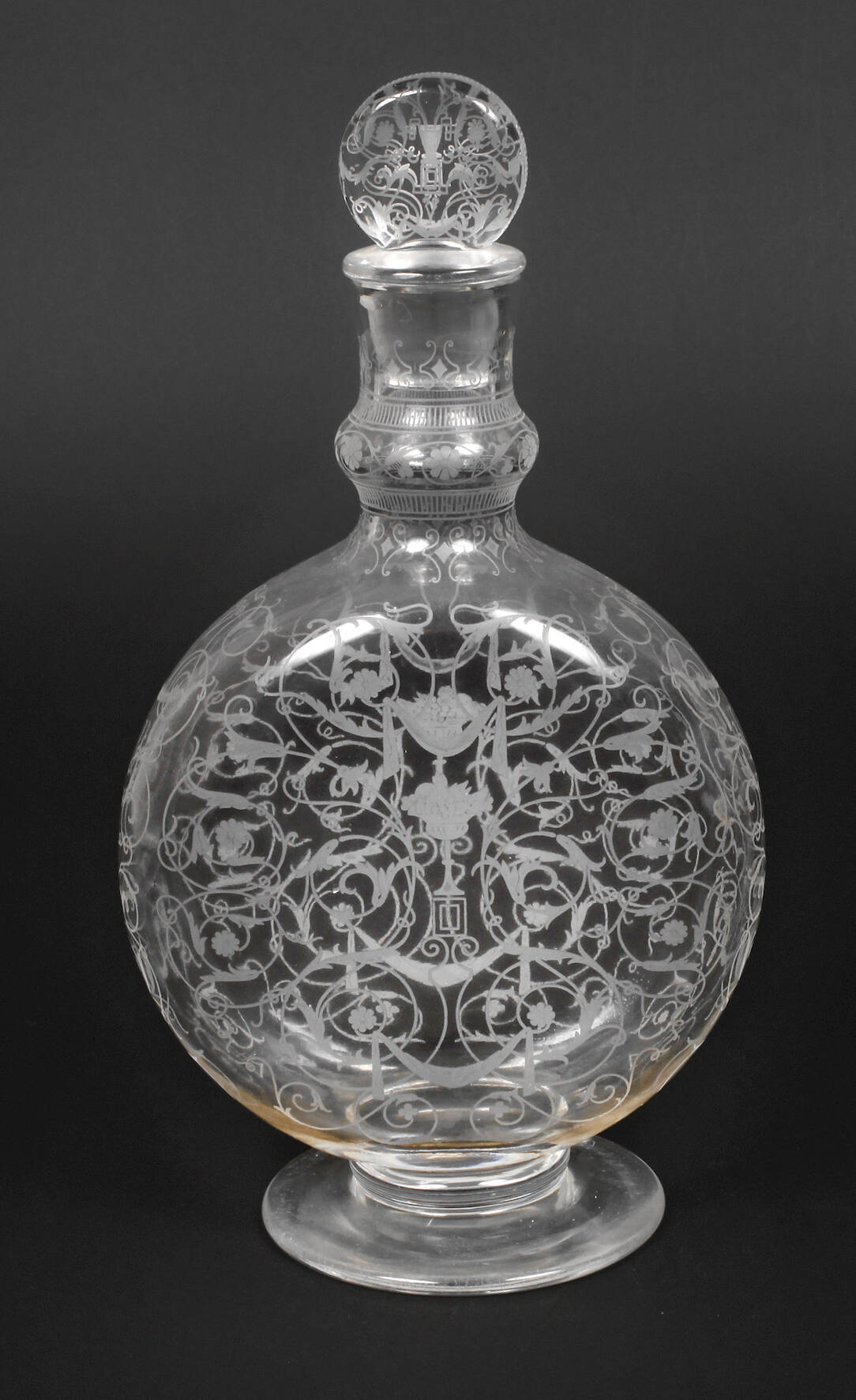 2. Hälfte 19. Jh., in der Art von Lobmeyr Wien, ungemarkt, farbloses Glas, Scheibenfuß, Nodus, flacher Korpus mit feinem Mattschliff, Rollwerk, Blüten und Festons, ebenfalls abgeflachter Deckelknauf, normale Gebrauchs- und Altersspuren, Höhe 27,5 cm.