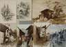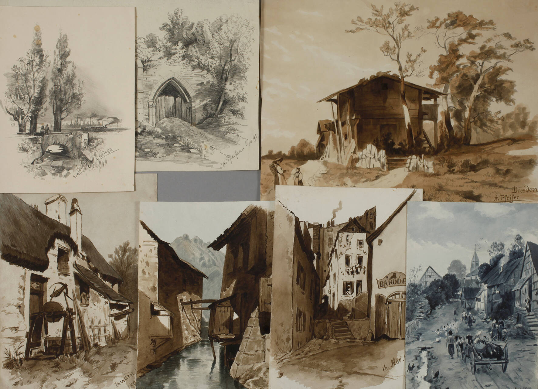 sieben Blatt mit verschiedenen Landschaftsdarstellungen, teils mit Figurenstaffage, Aquarelle und Bleistiftzeichnungen, teils datiert "1890/91", teilweise signiert, teils minimale Erhaltungsmängel, Blattmaße max. ca. 25 x 33 cm.