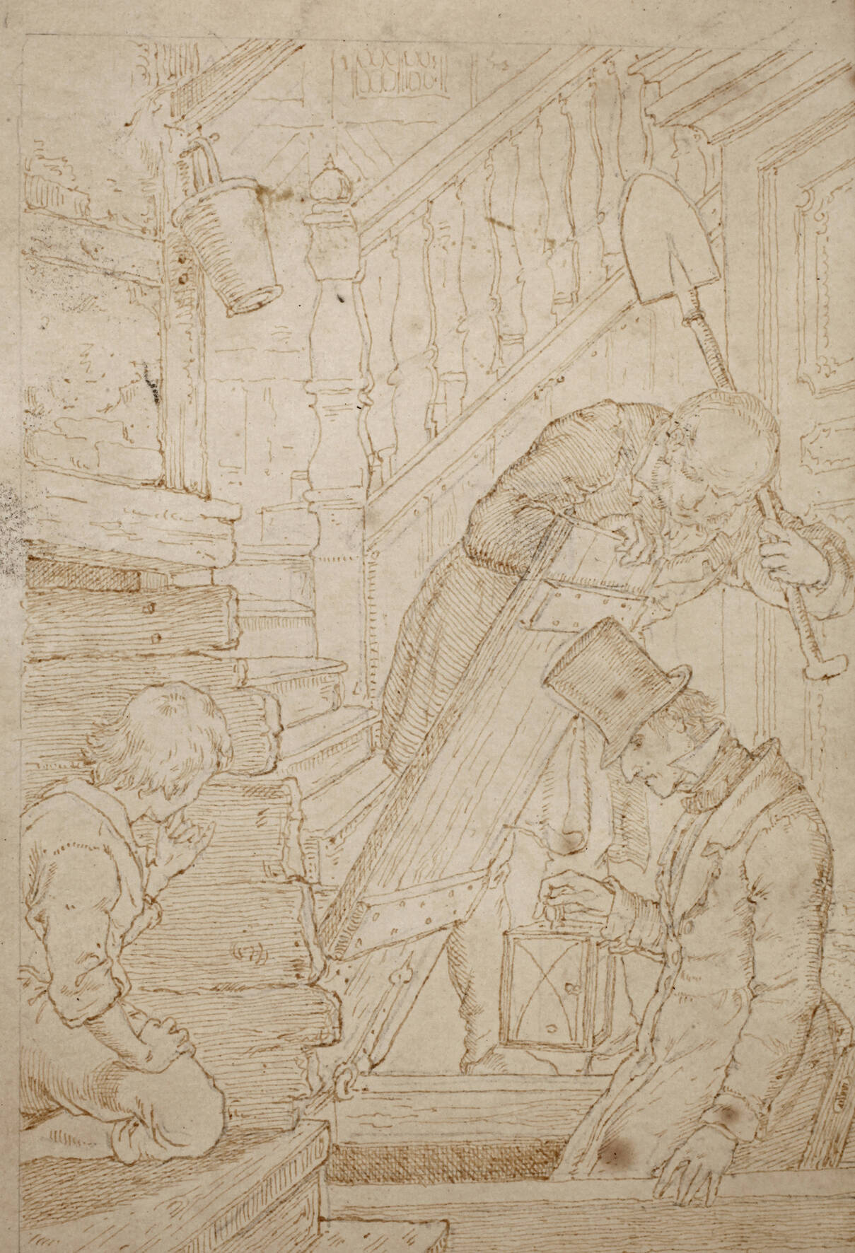 zwei ältere Herren mit Laterne und Schaufel, in eine versteckte Luke unter einer Treppe steigend, währenddessen ein junger Bursche die Szenerie gespannt beobachtet, fein ausgeführte Zeichnung in Sepia auf Papier, 2. Hälfte 19. Jh., rückseitig alt bezeichnet „Gustav Süs“ und Sammlerstempel, minimale Altersspuren, unter Passepartout montiert, Blattmaß ca. 13,4 x 8,4 cm. Künstlerinfo: eigentl. Konrad Gustav Süs, auch Gustav Süß, dt. Maler, Illustrator und Kinderbuchautor (1832 Rumbeck bis 1881 Düsseldorf), Studium an der Kunstakademie in Kassel und am Städelschen Institut in Frankfurt am Main bei Johann David Passavant und Jakob Becker, Bekanntheit erreichte der Künstler durch die Illustration von Swinegel-Hasen-Geschichte, ab 1850–51 Studium an der Kunstakademie in Düsseldorf und nachfolgend in Düsseldorf tätig, Quelle: Thieme-Becker, Müller „Biographisches Künstlerlexikon“ und Wikipedia.