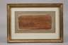 Blick von einer Anhöhe in eine weite Landschaft mit Hochheim, Tusche in Rötel auf Papier, 19. Jh., auf Rahmenrückseite in Kugelschreiber bezeichnet "Rückseite mit Bleistift vermerkt: Sicht von Kostheim nach Hochheim a./Main Schütz.", auf Unterlagekarton montiert, in Passepartout freigestellt und hinter Glas gerahmt, Blattmaße ca. 7,7 x 18 cm.