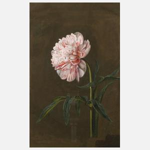 detailreiche Darstellung einer Pfingstrosenblüte am Stil, vor dunkelbraunem Grund, Aquarell und Deckfarben, rechts unten in Blei ligiertes Monogramm "KK" und datiert "d.(en) 26ten May 1834", unter Passepartout und hinter Glas in Berliner Leiste gerahmt (leicht bestoßen), Passepartoutausschnitt ca. 40,5 x 26,5 cm, Falzmaße ca. 58 x 43 cm.