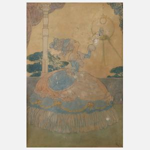 Dame mit Korsett und weitem Reifrock, beim Füttern von zwei Papageien, Bleistift und Aquarell, um 1920-30, rechts unten in Blei signiert "René Bull", Erhaltungsmängel, unter Passepartout und hinter Glas gerahmt, Passepartoutausschnitt ca. 25,5 x 17,8 cm. Künstlerinfo: britischer Illustrator und Fotograf (1872 Dublin bis 1942), ging nach Paris, um ursprünglich Ingenieurwissenschaften zu studieren, wandte sich aber der Kunst zu, Zeichenunterricht bei Caran d´Ache, ging zurück nach Irland, 1892 Umzug nach London, Reise nach Südafrika, Illustration zahlreicher Bücher, Quelle: Wikipedia England.