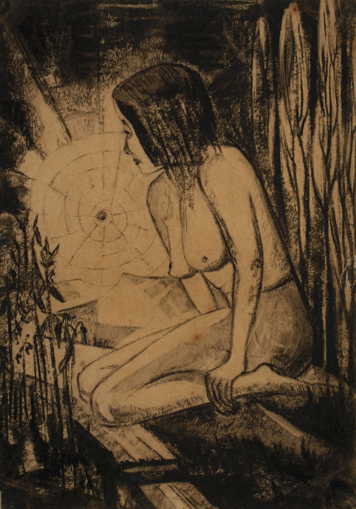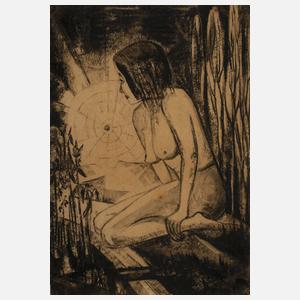 auf einer Waldwiese vor bergiger Landschaft sitzende, nackte junge Frau, mit in die Ferne gerichtetem Blick, Kohle auf Papier, links unten monogrammiert "E.P.", auf Unterlagekarton montiert und hierauf bezeichnet und datiert "Für Hannah, 26.11.(19)34", eingerissen und gering fleckig, Blattmaße ca. 38,5 x 27,5 cm.