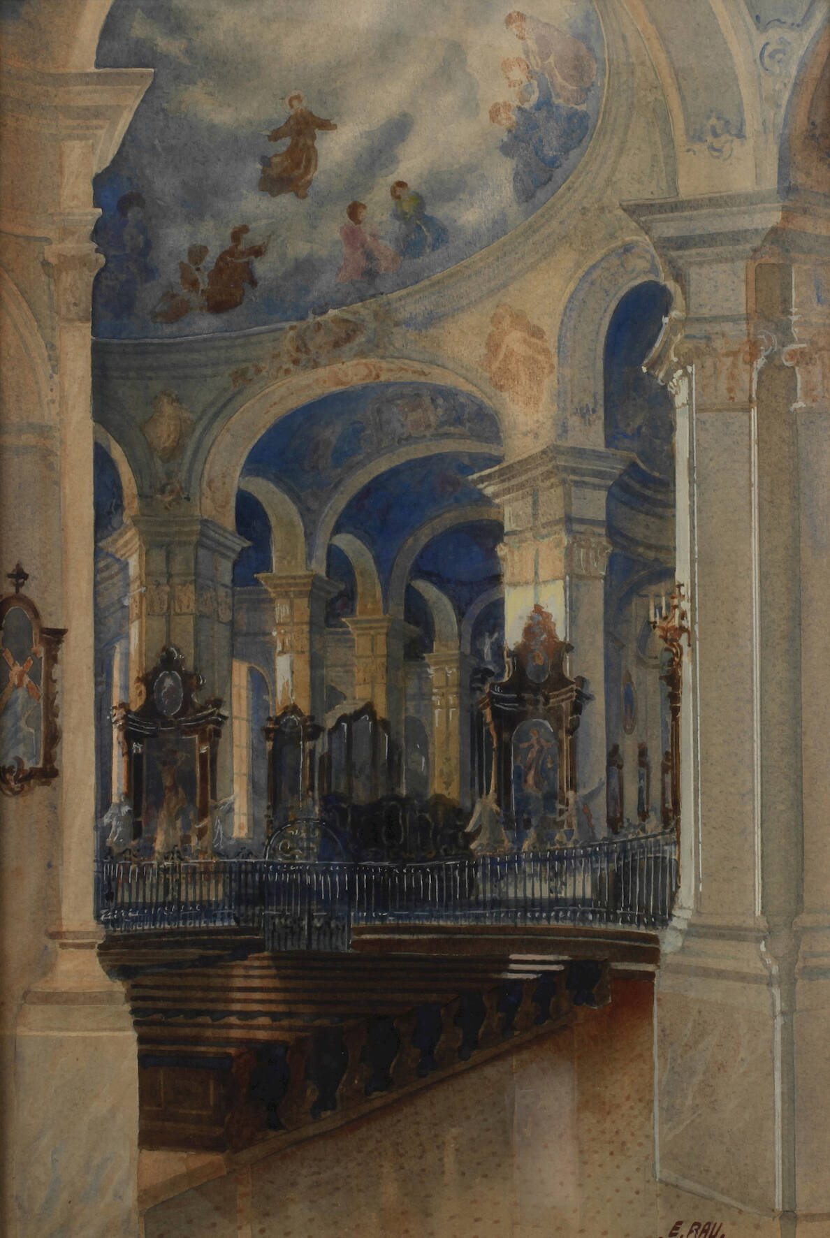 Blick in eine prächtige barocke Kirche mit ausgemalter Kuppel und zahlreichen Altären, Aquarell, rechts unten signiert und teils von der Rahmung verdeckt bezeichnet und datiert "E. Rau St. Gallen 1912", hinter Glas gerahmt, Sichtmaße ca. 51 x 35 cm. Künstlerinfo: eigentlich Carl (Karl) Emil Rau, dt. Illustrator, Portrait- und Genremaler (1858 Dresden bis 1937 München), zunächst zur Übernahme des Familienbetriebs der Dresdner "Lithographischen Anstalt J.H.G. Rau und Sohn" und zum Lithographen bestimmt, erste künstlerische Anleitungen durch seinen Vater, den Hoflithographen Carl Emil Heinrich Rau, studierte 1875–79 an der Akademie Dresden ab 1877 bei Leon Pohle und 1878–79 bei Ferdinand Wilhelm Pauwels, ab 1879 an der Münchner Akademie bei Carl Theodor von Piloty, Wilhelm von Lindenschmit den Jüngeren und Alexander Wagner, ab 1883 freiberuflich in München tätig, beeinflusst vom Defregger-Kreis, arbeitete als Illustrator für die Zeitschriften „Jugendlust“, "Gartenlaube" und „Fliegende Blätter“, Mitglied der Münchner Künstlergenossenschaft, der „Geselligen Vereinigung bildender Künstler Münchens“ und des Reichsverbandes Bildender Künstler Deutschlands, beschickte den Münchner Glaspalast, tätig in München, Quelle: Thieme-Becker, Saur "Bio-Bibliographisches Künstlerlexikon", Dressler, Schülerlisten der Dresdner Akademie, Matrikel der Münchner Akademie, Bruckmann "Münchner Maler des 19./20. Jh.", Bénézit, Müller-Singer, Info Cornelia Oelwein und Werner Merkl sowie Wikipedia.