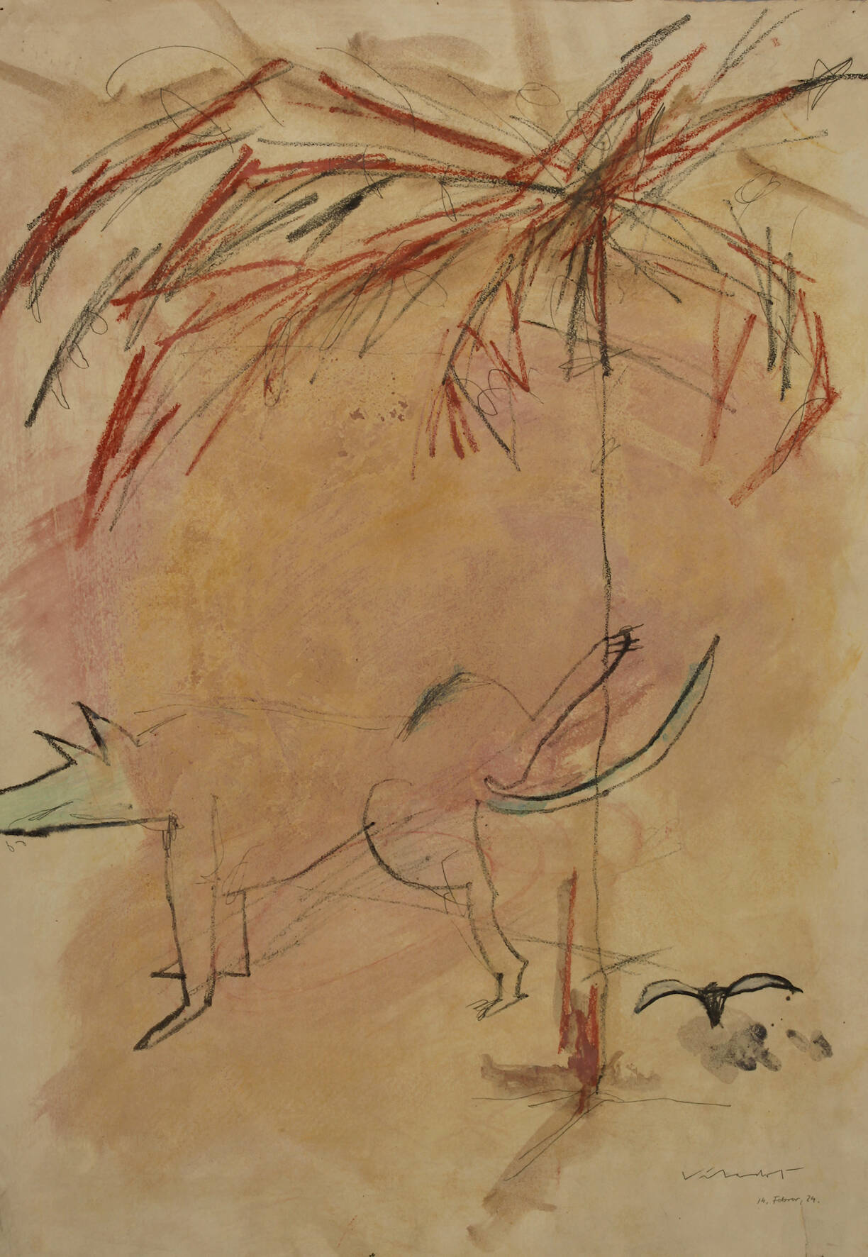 an einen Baum pinkelnder Hund, Mischtechnik auf Velin, rechts unten unleserlich signiert und datiert "14. Februar (19)84", etwas wellig, Blattmaße ca. 73 x 52,5 cm.