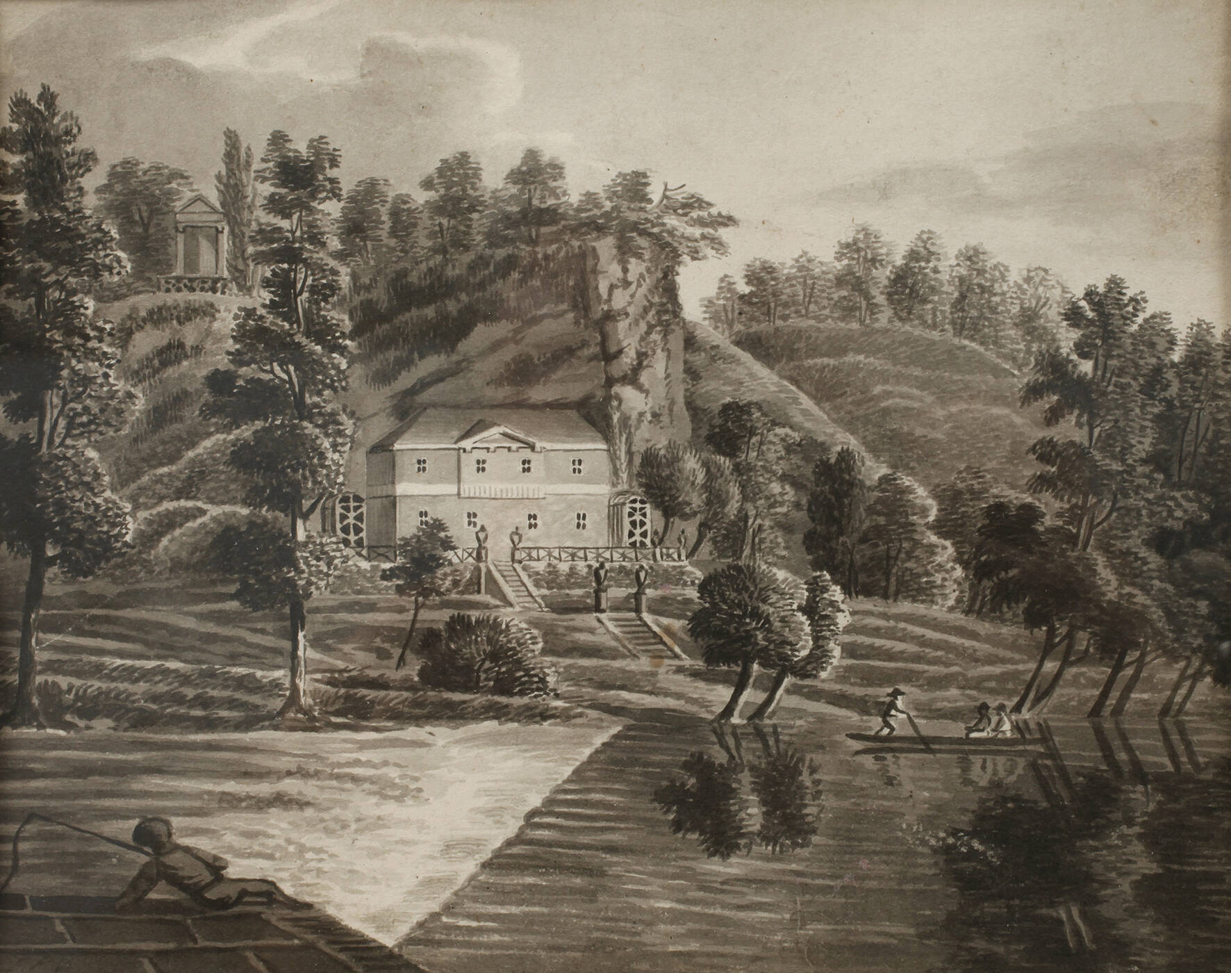 Blick über die Weißeritz auf ein am Fels gebautes Haus, umgeben von einigen Baumgruppen, Tusche, teils laviert, Mitte 19. Jh., rückseitig ungeprüfte typographische Zuschreibung an Johann Philipp Veith, unter Passepartout und hinter Glas in Biedermeierrahmen gerahmt, Passepartoutausschnitt ca. 16 x 20,2 cm, Falzmaße ca. 26,5 x 35 cm.