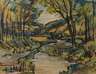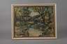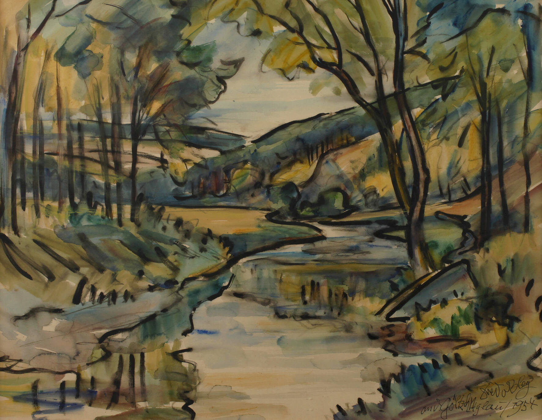herbstliche Vogtlandlandschaft bei Mylau, Aquarell über Bleistiftvorzeichnung, rechts unten signiert, betitelt und datiert "Fredo Bley, an d. Göltz[s]ch Mylau/1954", rückseitig Foto des Grabes von Fredo Bley, schön hinter Glas gerahmt, Falzmaße ca. 49 x 62 cm. Künstlerinfo: eigentlich Fredo Robert Bley, dt. Maler und Graphiker (1929 Mylau im Vogtland bis 2010 Reichenbach), 1943–46 Lithographenausbildung bei Carl Werner in Reichenbach, 1948–56 Lehre und Tätigkeit als Dekorations- und Schriftenmaler, Anregung durch den Maler Walter Löhner, weitestgehend Autodidakt, seit 1952 Mitglied des Verbandes Bildender Künstler (VBK) der DDR, 1957–64 als Ziegelei- und Baufacharbeiter tätig, ab 1966 freischaffend, beschickte zahlreiche Ausstellungen, unter anderem 2002 im neuen Bundeskanzleramt Berlin, tätig in Mylau, später in Buchwald, Quelle: AKL, Eisold “Künstler in der DDR”, Frank Weiß "Malerei im Vogtland" und Wikipedia.