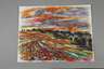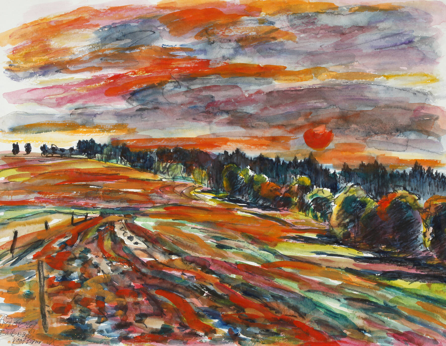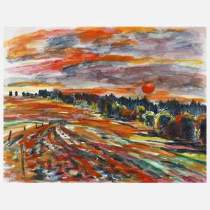 Blick über Wiesen und Felder auf Baumgruppen und Wald, unter von der Sonne in Rot- und Orangetöne getauchtem Himmel, kraftvolle Landschaftsmalerei in leuchtender Farbigkeit, Aquarell über Faserschreiber auf Aquarellkarton, links unten signiert, bezeichnet und datiert "Fredo Bley Buchwald Vogtland (20)02", Blattmaße ca. 49,7 x 65 cm. Künstlerinfo: eigentlich Fredo Robert Bley, dt. Maler und Graphiker (1929 Mylau im Vogtland bis 2010 Reichenbach), 1943–46 Lithographenausbildung bei Carl Werner in Reichenbach, 1948–56 Lehre und Tätigkeit als Dekorations- und Schriftenmaler, Anregung durch den Maler Walter Löhner, weitestgehend Autodidakt, seit 1952 Mitglied des Verbandes Bildender Künstler (VBK) der DDR, 1957–64 als Ziegelei- und Baufacharbeiter tätig, ab 1966 freischaffend, beschickte zahlreiche Ausstellungen, unter anderem 2002 im neuen Bundeskanzleramt Berlin, tätig in Mylau, später in Buchwald, Quelle: AKL, Eisold “Künstler in der DDR”, Frank Weiß "Malerei im Vogtland" und Wikipedia.
