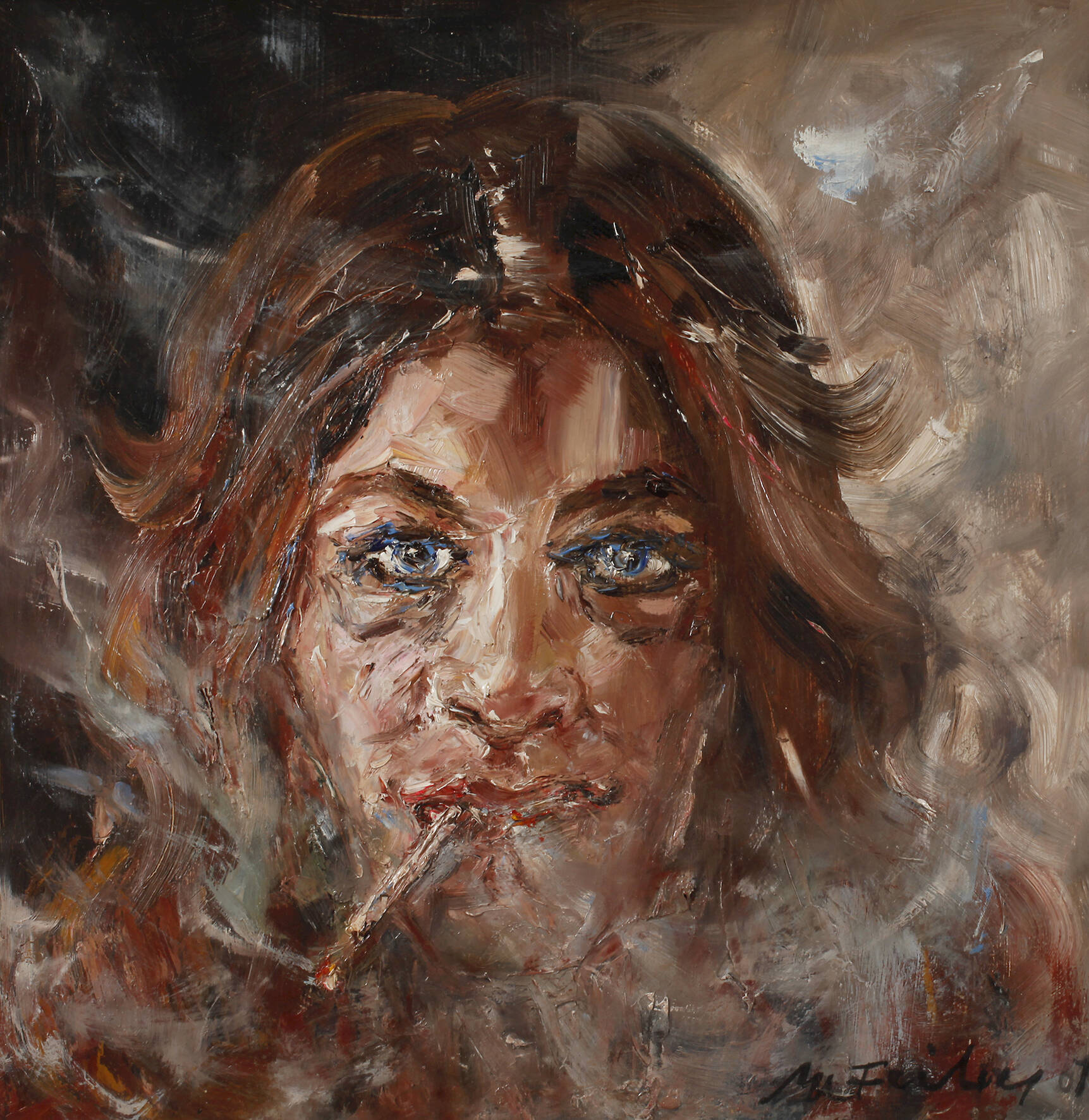Zigarette rauchende, den Betrachter anblickende Frau mit schulterlangem Haar, pastose Portraitmalerei in warmer Farbigkeit, Öl auf Hartfaserplatte, rechts unten signiert und datiert "M. Feiler (2)010", rückseitig betitelt "Der Lack ist ab", gerahmt, Falzmaße ca. 37 x 37 cm. Künstlerinfo: dt. Maler, Entwerfer und Illustrator (1925 Plauen/Vogtland bis 2020 Plauen), 1939–43 Schüler der Plauener Kunstschule, gefördert von Kurt Geipel und Walter Löbering, ab 1943 Kriegsdienst im 2. Weltkrieg und schwere Verwundung, nach 1945 zeitweise Tätigkeit als Werbegestalter und Entwerfer für Textilunternehmen, ab 1952 künstlerisch freischaffend, Malaufenthalte in Venedig und auf Mallorca, 2011 Ernennung zum Ehrenbürger von Plauen, tätig in Plauen, Quelle: Vollmer, Frank Weiß "Malerei im Vogtland" und Internet.