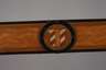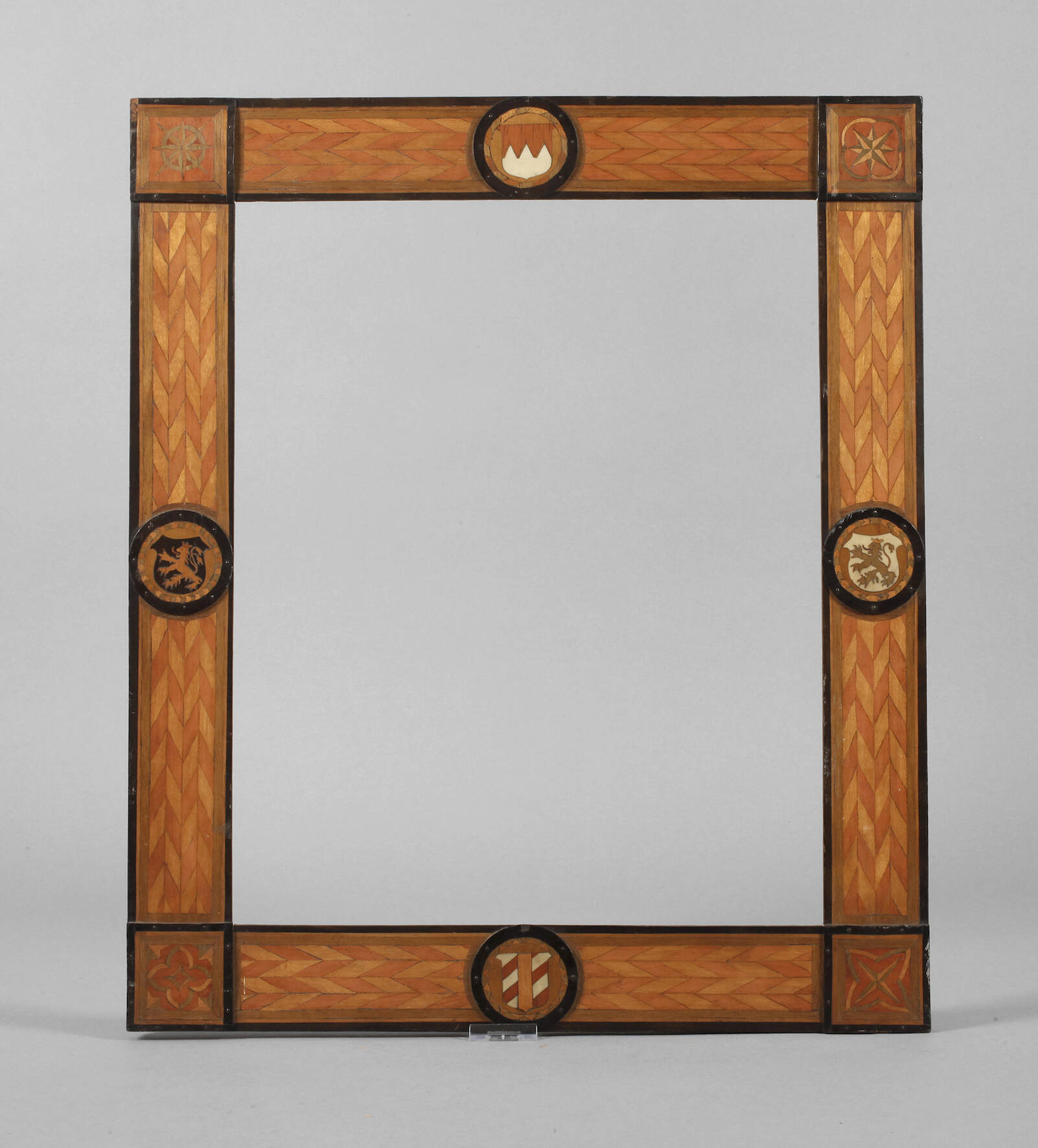 2. Hälfte 19. Jh., Rahmen aus ca. 6,5 cm breiter, mit unterschiedlich farbigem Holzfurnier und anderen Materialien aufwendig ornamental belegter Holzleiste, je mittig ein appliziertes Wappen in runder Kartusche, die Ecken quadriert, Altersspuren, Falzmaße ca. 46 x 37 cm.
