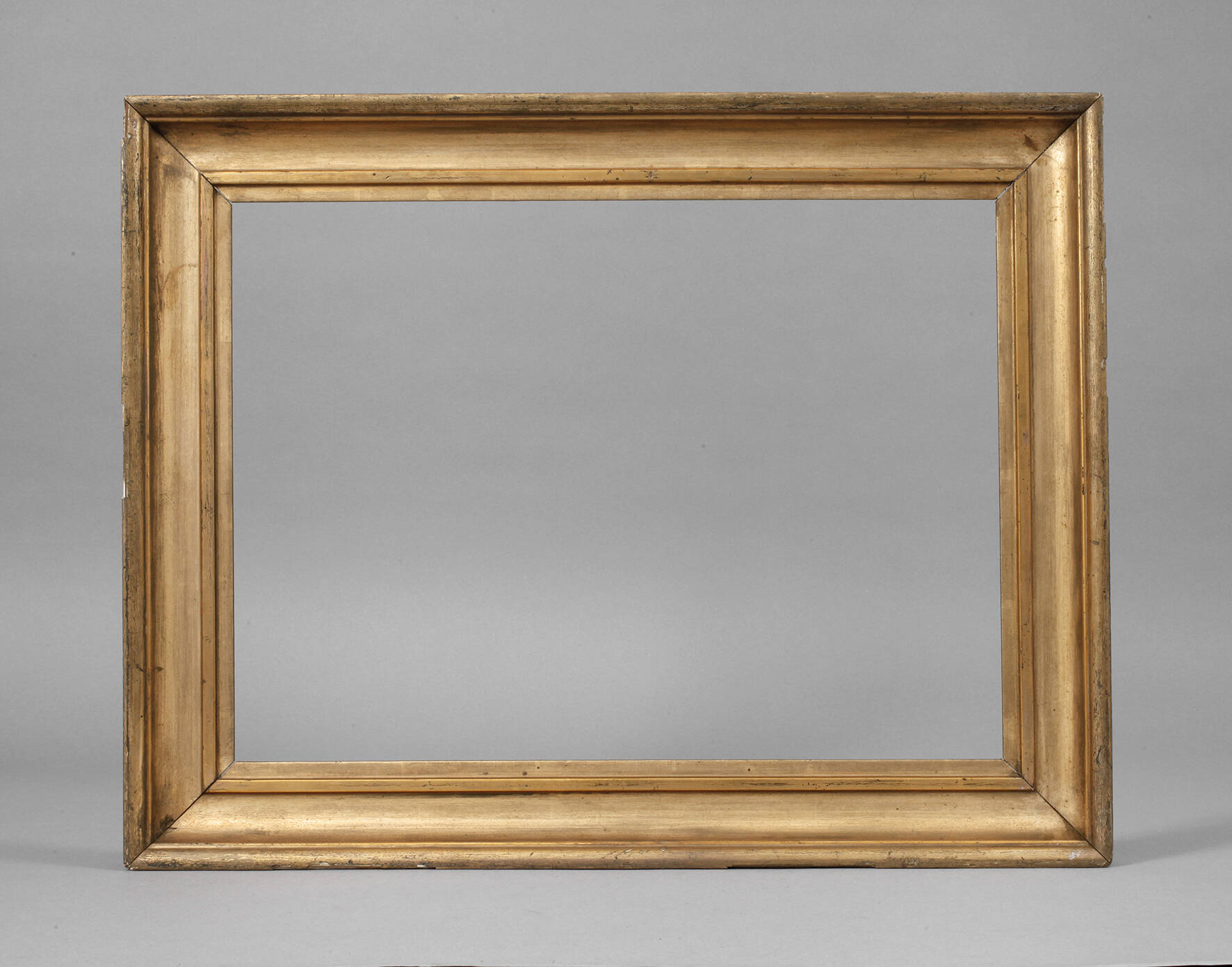2. Hälfte 19. Jh., ca. 7 cm breite, steigend profilierte und versilberte Holzleiste, Gehrungen geschnitten, geringe Verluste und Retuschen mit Goldbronze, Falzmaße (etwas verbreitert) ca. 40,5 x 54,5 cm.