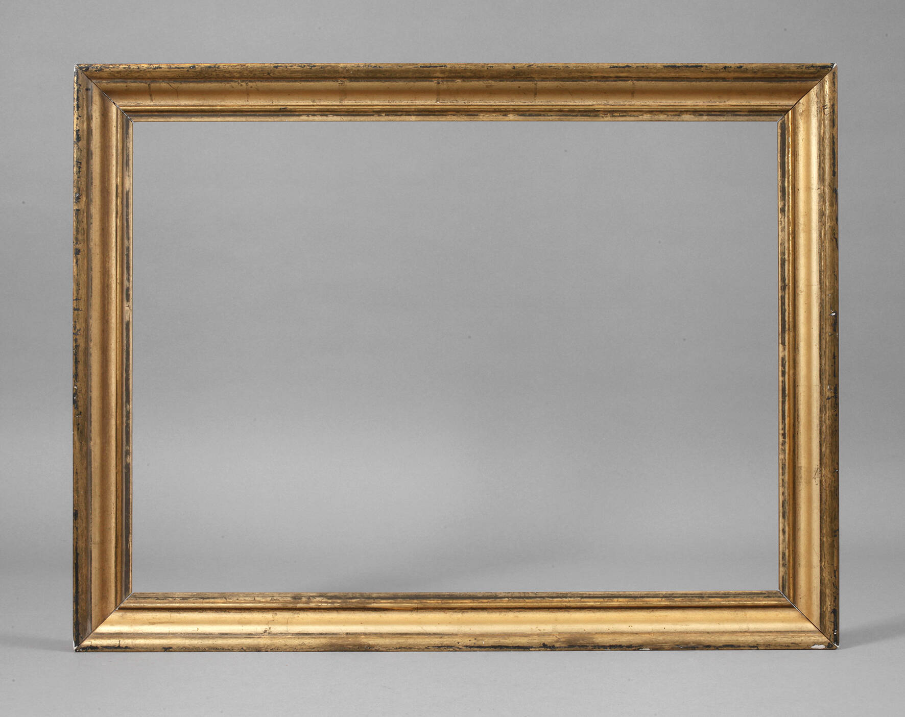 2. Hälfte 19. Jh., ca. 5,5 cm breite, steigend profilierte und versilberte Holzleiste, Gehrungen geschnitten, geringe Verluste, Falzmaße ca. 46 x 62,5 cm.