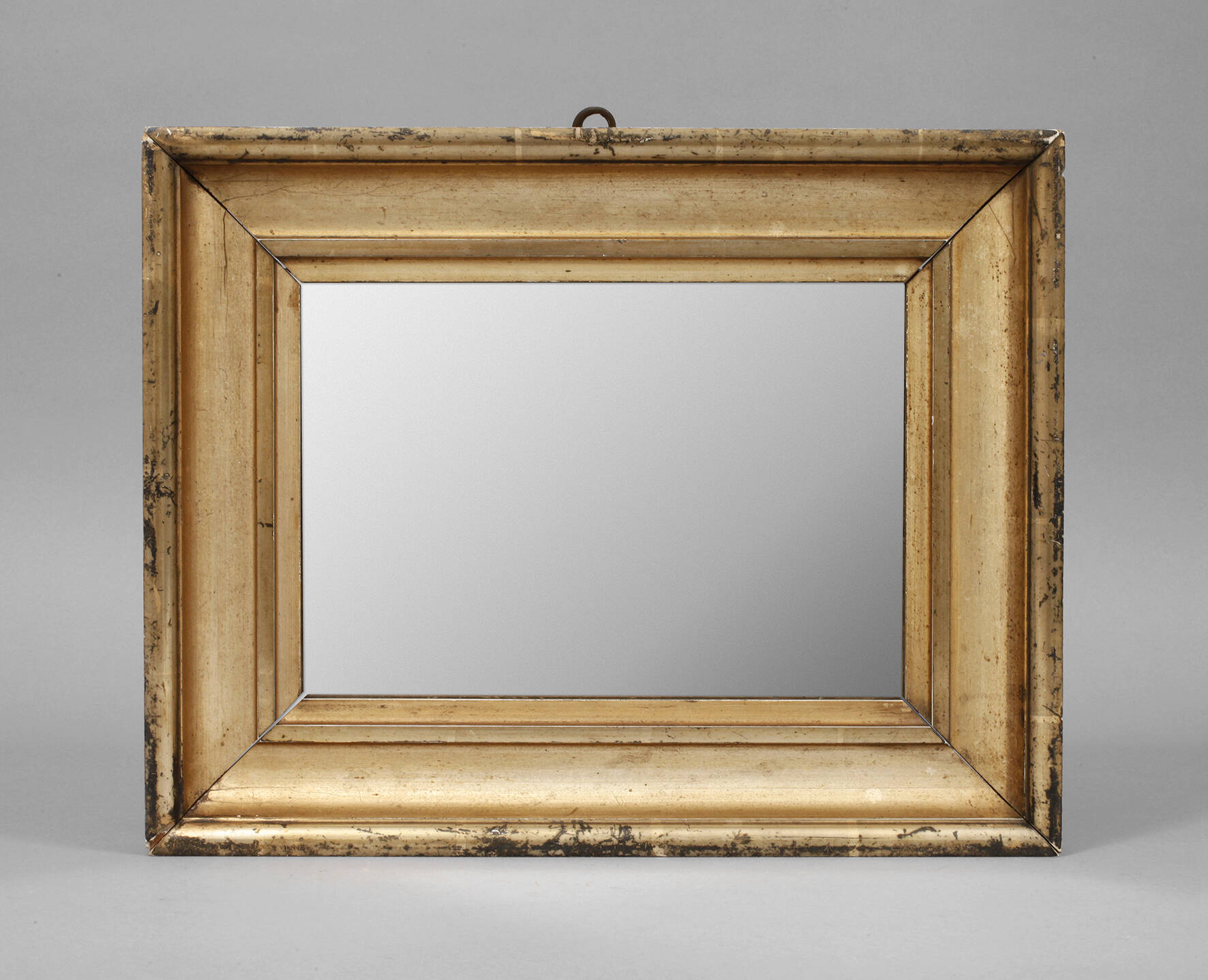 um 1860, ca. 7 cm breite, steigend profilierte, versilberte Holzleiste, Gehrungen geschnitten, leichte Altersspuren und geringe Verluste, Falzmaße ca. 21,5 x 30 cm, beigegeben Spiegelglasscheibe, mit Erhaltungsmängeln.