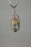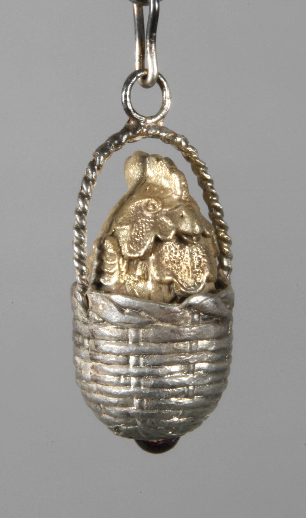 1. Hälfte 20. Jh., Silber teilweise vergoldet und gestempelt 88 Zolotniki sowie Marke LP, vollplastischer Hahnenkopf in einem Weidenkorb und an der Unterseite Granatcabochon, leichte Tragespuren, L Anhänger ca. 36 mm, G ca. 15,7 g.