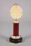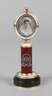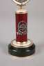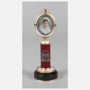 2. Hälfte 20. Jh., Gelbgold gestempelt 56 Zolotniki, Meistermarke SF für Sergei Fudol, säulenartiges Modell mit massiver Basis aus dunkelgrünem Nephrit, teils aufwendig guillochiert, in elfenbein- bzw. bordeauxfarbenem Transluzidemaille verziert, aufgelegter Doppeladler aus Silber mit zentralem Rubin, bekrönt von Ovalrahmen, dieser flankiert von unzähligen Diamantrosen und weiterem Farbstein, in originalem Holzetui, dieses gestempelt Fabergé, H 16,5 cm.