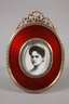 2. H. 20. Jh., GG gestempelt 56 Zolotniki, Meistermarke H.W. für Henrich Vigstren, teils vergoldeter Ovalrahmen mit durchbrochener Schleifenbekrönung, die Front aufwendig quillochiert und in rotem Transluzidemaille eingelegt, der Bildausschnitt flankiert von zahlreichen Diamantrosen, rückseitiger Aufsteller verziert von reliefiertem Doppeladler, im originalen Holzetui bezeichnet Fabergé, G ges. 105,6 g, H 9 cm.