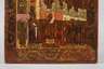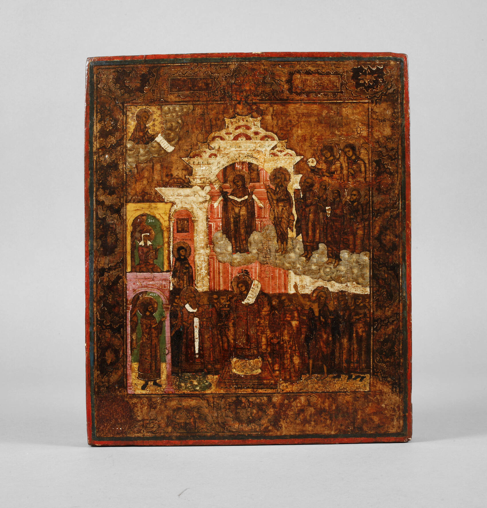 Russland, frühes 19. Jh., Tempera über Kreidegrund auf zweifach gesperrter massiver Laubholzplatte, partiell vergoldet, kirchenslawisch bezeichnet, Maria Schutz und Fürbitte, mit spitzem Pinsel festgehaltene Szene mit Maria auf Wolkensockel, in der Hand ihren Schleier tragend, links und rechts umstanden von zahlreichen Engeln und Heiligen, im unteren Bildfeld Darstellung des Andreas, umringt von Gläubigen, auf Maria deutend und sich an Epiphanius wendend, Erhaltungsmängel, Maße 31,5 x 27 cm.