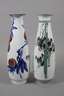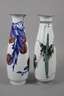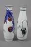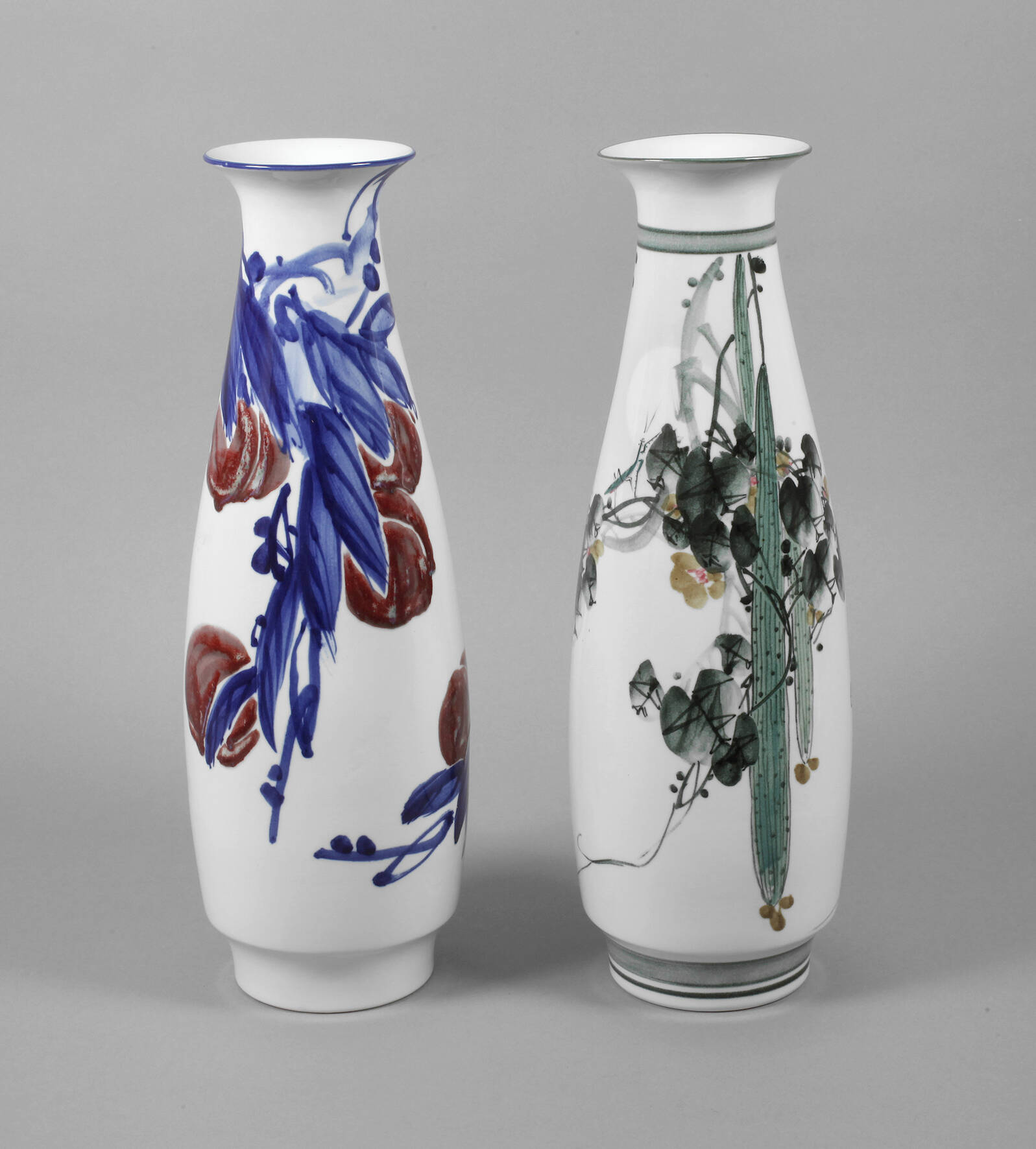 2. Hälfte 20. Jh., am Boden geprägte Marke, zusätzlich signiert, Weißporzellan in polychromer Unterglasurbemalung, keulenförmige Modelle mit leicht eingezogenem Stand und ausschwingender Mündung, verziert von leicht abstrahierten vegetabilen Motiven, jeweils im originalen Etui, gute Erhaltung, H je 50 cm.