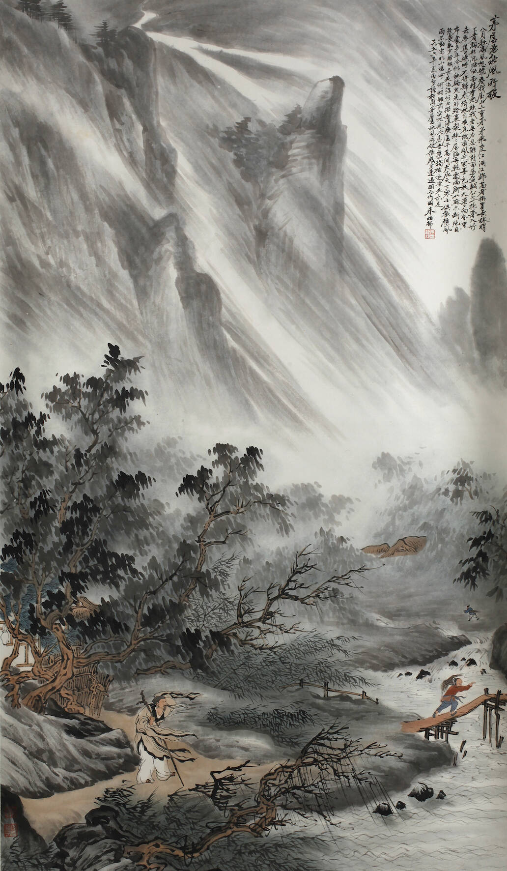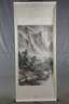 20. Jh., gestempelt und signiert, Farbholzschnitt auf Papier, figürliche Szene aus der Fabelwelt in Landschaft, textil gefasst, die Schmalseiten holzverstärkt, sehr gute Erhaltung, Maße 190 x 80 cm.
