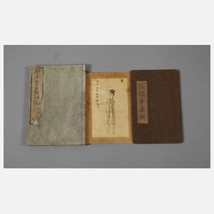 Anfang 20. Jh., Holzschnitte auf Japanpapier, in Ornamentpapier gebundenes Exemplar mit Kalligrafie und Bebilderung, dazu textil gebundenes Exemplar mit zehn Darstellungen junger Frauen in mannigfaltigen Gewändern, unterschiedliche Maße und Erhaltungen.