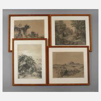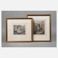 dabei "Zwei oberbayrische Mädchen", zwei sitzende Mädchen beim Stricken bzw. Lesen am Wegesrand, vor morbidem Bauernhaus in gebirgiger Landschaft, Radierung mit Kaltnadel überarbeitet, rechts unter der Platte signiert, ortsbezeichnet und datiert "P. Heinel in München 1840 invent. fect.", weiterhin "Die Sennerin", Darstellung einer Frau in ländlicher Tracht mit großem Reff auf dem Rücken, in Begleitung zweier Ziegen, auf felsigem Pfad im Hochgebirge, Radierung mit Kaltnadel überarbeitet, in der Darstellung signiert und datiert "P. Heinel 1842", hierzu bemerkt Andresen "... [die nicht zahlreichen Radierungen sind] mit sicherer Nadel, mit Fleiß und Liebe behandelt; zugleich wahr und getreu in der Auffassung.", sehr schön als Pendants hinter Glas und Passepartout gerahmt, Plattenmaße ca. 15 x 17,5 cm und 20,5 x 17 cm. Künstlerinfo: eigentlich Johann Philipp Heinel, dt. Landschafts-, Portrait- und Genremaler sowie Radierer und Lithograph (1800 Bayreuth bis 1843 München), zunächst zum Kaufmann bestimmt und ab 1812 Lehre in Nürnberg, parallel Hinwendung zu Kunst und Musik, 1818 Aufgabe der kaufmännischen Tätigkeit und 1818–20 Schüler der Nürnberger Zeichenschule, studierte 1820–26 mit königlichen Stipendium Maximilians II. von Bayern an der Münchner Akademie Historienmalerei bei Johann Peter von Langer und Robert von Langer, anschließend freischaffend in Nürnberg, wegen finanzieller Not als Portraitmaler tätig, ab 1826 Hinwendung zum Genre mit Motiven aus dem Volksleben und zur Landschaft, unternahm in den 1830er Jahren Studienreisen nach Tirol, Oberbayern und durch Franken, ab 1832 in München ansässig, 1842 Erkrankung, tätig in München, Quelle: Thieme-Becker, Saur "Bio-Bibliographisches Künstlerlexikon", Müller-Singer, Seubert, Müller-Klunzinger, Nagler, Matrikel der Münchner Akademie, Bruckmann "Münchner Maler des 19./20. Jh.", Bénézit, Andresen, Grieb "Nürnberger Künstlerlexikon" und Wikipedia.