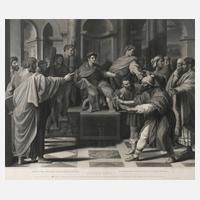 prächtiger, vielfigürlicher Kupferstich nach einem Gemälde von Raffael Sanzio, Kupferstich, unter der Darstellung bezeichnet und datiert "Published as the Act directs Oct. 5th. 1820 by T. Holloway, R. Slann & T. S. Webb, Hampton Court" sowie betitelt "To the King", leichte Altersspuren und minimal fleckig, hinter Glas gerahmt, Darstellungsmaße ca. 47,5 x 61,5 cm, Blattmaße ca. 53 x 63,5 cm. Künstlerinfo: engl. Bildnismaler, Graphiker und Medailleur (1748 London bis 1827 Coltishall bei Norwich), Lehre bei einem Siegelschneider, Besuch der Royal Academy und stellte hier auch seit 1773 aus, zunächst hauptsächlich als Bildnisstecher tätig, Ernennung zum Königlichen Hofkupferstecher, Quelle: Thieme-Becker.