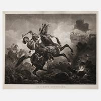 kämpfende Türken zu Pferd in felsigem Gelände, Mezottintoradierung, 1. Hälfte 19. Jh., unter der Darstellung mittig betitelt "L´Attaque Repoussée.", weiterhin unter der Darstellung in der Platte bezeichnet rechts "Gravé par Jazet" und links "Peint par Carle Vernet", in der Darstellung signiert "C. Vernet", an der unteren Blattkante Verlegerangaben, hinterlegter Einriss, Erhaltungsmängel, Darstellungsmaße ohne Schrift ca. 47,5 x 59 cm, Blattmaße ca. 54 x 64 cm. Künstlerinfo: bedeut. franz. Aquatintastecher und Radierer, Schüler seines Onkels L. P. Debucourt, beschickte bis 1865 den Pariser Salon, tätig in Paris, Quelle: Thieme-Becker.