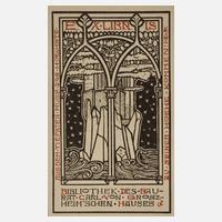 Exlibris des Baurates Carl von Groszheim, Blick durch ein gotisches Doppelspitzbogenfenster, auf eine im Wasser stehende Burg vor Sternenhimmel, Druck in Rot und Schwarz, in der Darstellung ligiertes Monogramm und Datierung "ML (18)97", auf Unterlagekarton montiert und hierauf bezeichnet "Melchior Lechner 1897 Gutenberg-Katalog Nr. 6583", Darstellungsmaße ca. 10,2 x 6,2 cm, Blattmaße 10,8 x 6,7 cm. Künstlerinfo: dt. Maler, Graphiker und Buchkünstler (1865 Münster bis 1937 Raron/Kanton Wallis, Schweiz), ab 1879 Ausbildung als Glasmaler, parallel Besuch von Kursen an der Münsterschen Kunstgenossenschaft, nach der Lehre ging er nach Berlin, 1884-94 Besuch der Malklasse an der Kunstakademie in Berlin, 1886 Aufenthalt in Bayreuth, 1896 Ausstellung bei Fritz Gurlitt, 1900 Beteiligung an der Weltausstellung in Paris, ab 1906 Mitglied der Theosophischen Gesellschaft Adyar, 1910 zusammen mit Karl Wolfskehl Reise nach Indien, Ceylon, Madras und Adyar, verstarb beim Besuch des Grabes von Rainer Maria Rilke, Quelle: Thieme-Becker, Vollmer und Wikipedia.