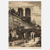 Blick entlang einer am Wasser gelegenen Häuserzeile mit Personenstaffage auf Notre Dame in Paris, siehe Schneidermann 20 und Delteil 24, hier eines der Vorzugsexemplare auf Chinapapier und dieses auf Bütten gewalzt, Radierung, 1850, in der Platte oben rechts monogrammiert "C. M.", unter der Darstellung in der Platte teils schwer leserlich rechts bezeichnet "Imp. a Delite Rue S. Jacque...", links bezeichnet "... par L´Artiste und mittig betitelt "Le petit pont", Blatt sieben der Folge "Eau-Fortes sur Paris", Chinapapier gebräunt und Büttenpapier etwas fleckig, Darstellungsmaße ohne Schrift ca. 24,3 x 18,7 cm, Blattmaße ca. 32,5 x 24,5 cm. Künstlerinfo: auch Méryon, frz. Maler und Graphiker (1821 Paris bis 1868 Charenton-le-Pont), 1839–47 Mitglied der frz. Marine, lernte das Radieren bei Eugen Bléry, zählt zu den bedeutendsten Radierern des 19. Jh., Quelle: Thieme-Becker und Wikipedia.