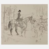 Reiterin und älterer Herr in Kutsche, sich im Park begegnend, Lithographie, um 1900, wohl etwas späterer Abzug, im Stein links unten ligiertes Monogramm "HTL", etwas knitterspurig, im Randbereich Einrisse (nicht die Darstellung betreffend), Darstellungsmaße ca. 23 x 28 cm, Blattmaße ca. 36 x 52,5 cm. Künstlerinfo: eigentlich Henri Marie Raymond de Toulouse-Lautrec-Monfa, frz. Maler, Graphiker und Plakatkünstler (1864 Albi bis 1901 auf Schloss Malromé Gironde), auf Grund der inzestuösen Verbindung seiner Eltern mit Erbkrankheiten belastet, absolvierte zahlreiche Sanatorien- und Krankenhausaufenthalte, hierbei Hinwendung zur Kunst, erste Unterrichtung in Zeichnen durch René Princeteau in Paris, Förderung des Berufswunsches Maler durch die Eltern, ab 1882 Schüler des Pariser Modemalers Léon Bonnat, später bei dem Salonmaler Fernand Cormon, starke Beeinflussung und Freundschaften unter der Pariser Künstler-Bohéme wie Vincent van Gogh, Émile Bernard, Louis Anquentin und Francois Gauzi, 1884 eigene Wohnung und Atelier am Montmartre in Paris, die umliegenden Vergnügungsetablissements und Lokale werden sein zweites Zuhause, hier erste Ausstellungen und Hinwendung zur Plakatkunst sowie Aufträge als Werbegraphiker, fertigte Lithographien als Plakate oder als Illustrationen für Zeitungen und Zeitschriften meist mit Künstlern und Persönlichkeiten der französischen Belle Époque (die er zum größten Teil persönlich kannte, z.B. 1885 Aristide Bruant), 1888 Hinwendung zum Zirkus-, Cabaret und Halbweltmilieu, Quelle: Thieme-Becker und Wikipedia.