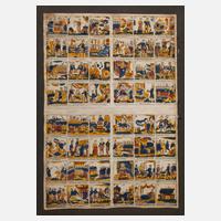 Darstellung des Lebens von Napoleon (1769 Ajaccio bis 1821 Sankt Helena) in 48 Miniaturen, jeweils mit Untertitel, handkolorierte Holzschnitte, um 1830, auf Unterlagekarton geheftet (dieser eingerissen), vom Druck teils knitterspurig, partiell etwas braunfleckig, Maße der jeweiligen Miniaturen ca. 4,5 x 4,5 cm, Blattmaße ca. 40 x 28,5 cm.