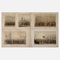 fünf Blatt, diese betitelt "Comité des Schiller Festzuges", "Abtheilung der Deputation des Bürger-Militärs", "Die Buchbinder", "Der Künstler-Verein" und "Die Maler", jeweils mit Überschrift "Der Schillerzug in Hamburg am 13. November, 1859", Lithographien mit Tonplatte, jeweils rechts unten Angabe "Herausgegeben v. Ch. Fuchs, Ness No. 7, Hamburg", wasserrandig und braunfleckig, Darstellungsmaße ca. 26 x 45 cm, Blattmaße 35,5 x 56 cm.