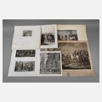 Teilkonvolut Radierungen aus der Reihe Galeries historiques de Versailles um 1840: Bataille de Lutzelberg 1758, Le Roi visite les Manufactures des Gobelins, Louis XVI donne des instructions à Mr. de la Pérouse 1785, Louis XVI distribue des secours aux pauvres 1788, La Garde Nationale de Paris part pour l'armee 1792, Combat de Gillette 1793, Bataille de Peyrestortes 1793, Prise du Camp de Pérulle 1793, Prise de Menin 1793, Ville et Château de Nice 1796, Bonaparte commandant en chef 1798, Bataille du Mont-Thabor 1799, Halte de l'armée francaise à Sienne 1799, Bataille de Hohenlinden 1800, Entrevue de Napoleon et du pape Pie 1804, Napoleon aux Invalides 1804, Combat d'Amstetten 1805, Le premier bataillon du 4. Regt. de Ligne Austerlitz 1805, Le Maréchal Ney remet aux soldats 1805, Napoleon recoit à Finkenstein 1807, Mariace du Prince Jérome 1807, Arrivée de Marie-Louise 1810, Combat de Krasnoé 1812, Combat de Champ Aubert 1814, Combat de Claye 1814, Revue de la garde nationale au champ de Mars 1825, Bivouac de la garde nationale dans la cour du Louvre 1830, Le Duc d'Orleans 1830, Le Roi prête serment en présence des Chambres de maintenir la Charte de 1830, Le Roi au milieu de la garde nationale dans la nuit du 5 Juin 1832. - Zwei kolorierte Lithographien Bataille de Leipzig und de St. Georges; jeweils unterschiedliche Maße und Erhaltungen, teilweise Stockflecken, Einrisse, diese beziehen sich vor allem auf die Ränder, die Darstellungen meist altersgemäß gut erhalten.