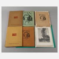 vorhanden sind die Hefte April–Mai 1895, 4/1896 und 5/1896, jeweils mit dem von Franz von Stuck gestalteten Titelblatt, eingebunden sind graphische Beilagen, unter anderem von Arnold Böcklin, Felicien Rops, G. Grumbach, Peter Halm, Heinz Heim, Carl Theodor Meyer-Basel, Jacobus Gerardus Veldheer, Eugen Kirchner, A. Krüger, Max Klinger, Otto Ubbelohde und Otto Gampert, nicht kollationiert, Erhaltungsmängel, beigegeben Mappe mit Arbeiten aus Pan, unter anderem von Thomas Theodor Heine, Felix Hollenberg, Wilhelm Volz, Karl Köpping, Bernhard Pankok, Daniel Mordant, Otto Greiner und Kampmann.