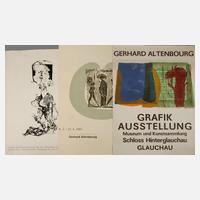 drei Stück, erschienen anlässlich der Ausstellung "Janus im Flüstern Pans" 2001, Museum der Bildenden Künste Leipzig, "Gerhard Altenbourg Grafik Ausstellung", Schloss Hinterglauchau, ohne Jahr und "Gerhard Altenbourg Arbeiten aus drei Jahrzehnten", Galerie Oben, Karl-Marx-Stadt, 1981, Offsetdruck bzw. Siebdruck, (Plakat Galerie Oben), unterschiedliche Erhaltungen, Maße max. ca. 84 x 59,5 cm. Künstlerinfo: eigentlich Gerhard Ströch, dt. Maler, Zeichner, Graphiker, Schriftsteller und Plastiker (1926 Rödichen-Schnepfental bis 1989 bei Meißen), nach Kriegsdienst und Verwundung zunächst schriftstellerisch tätig, 1945–48 Zeichenunterricht bei Erich Dietz, 1948–50 Studium an der Hochschule Weimar bei Hans Hoffmann-Lederer, anschließend freischaffend in Altenburg und 1955 Annahme des Pseudonyms „Altenbourg“, 1959 Beteiligung an der documenta 2 in Kassel, erhielt zahlreiche Ehrungen, 1969 Mitglied der Westberliner Akademie und des Instituts für Moderne Kunst Nürnberg, vertreten in zahlreichen Museen, Quelle: Vollmer, AKL und Internet.