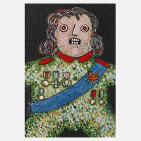mit Orden und Schärpe geschmückter General vor dunklem Grund, Farblithographie mit Prägung, 1982, rechts unten in Blei signiert "Baj" und links nummeriert "44/100" unter Passepartout und hinter Glas gerahmt, Darstellungsmaße ca. 24,5 x 14,7 cm. Künstlerinfo: ital. Bildhauer, Maler, Graphiker, Kunsttheoretiker und Anarchist (1924 Mailand bis 2003 Vergiate), Jurastudium an der Universität in Mailand und Studium an der Brera-Kunstakademie, Herausgeber verschiedener Zeitschriften, Zusammenarbeit mit Umberto Eco, Förderer der anarchistischen Bewegung in Italien, Quelle: Wikipedia.