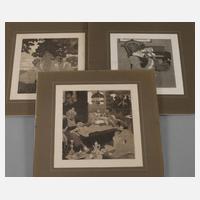 drei Heliogravuren mit erotischen Darstellungen, um 1910, eine Arbeit in der Platte signiert "Bayros", leicht knitterspurig und zwei Blatt mit leichtem Wasserrand, identisch hinter Glas im rahmenlosen Bilderträger, Darstellungsmaße ca. 24 x 22,5 cm. Künstlerinfo: auch Marquis de Bayros, bzw. Pseudonyme „Choisy le Conin“ oder "Venu de Bonestoc", österreichischer Maler, Graphiker und Illustrator (1866 Agram [Zagreb] bis 1924 Wien), Kindheit in Wien und Linz, studierte ab 1884 bei Eduard von Engert, August Eisenmenger und Christian Griepenkerl an der Wiener Akademie, verkehrt im Freundeskreis um Johann Strauß, ab 1897 an den Malschulen von Heinrich Knirr in München und bei Adolf Hölzel in Dachau, Mitglied der Gesellschaft „Vornehme Beobachter“, unternahm Studienreisen nach Paris und Italien, AKL vermerkt: "... Bekannt wurde er durch seine mehrere Skandale und Prozesse auslösenden Schwarz-Weiß-Illustrationen zu erotischer und pornographischer Literatur, die zumeist in Privatdruck publiziert wurden, ...", tätig in Wien und München, Quelle: Wikipedia, Vollmer und AKL.